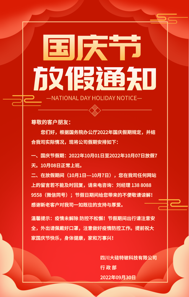 四川大硅特玻科技劉總攜公司全體員工提前祝大家國慶節快樂,生活幸福,身體健康,家和萬事興!